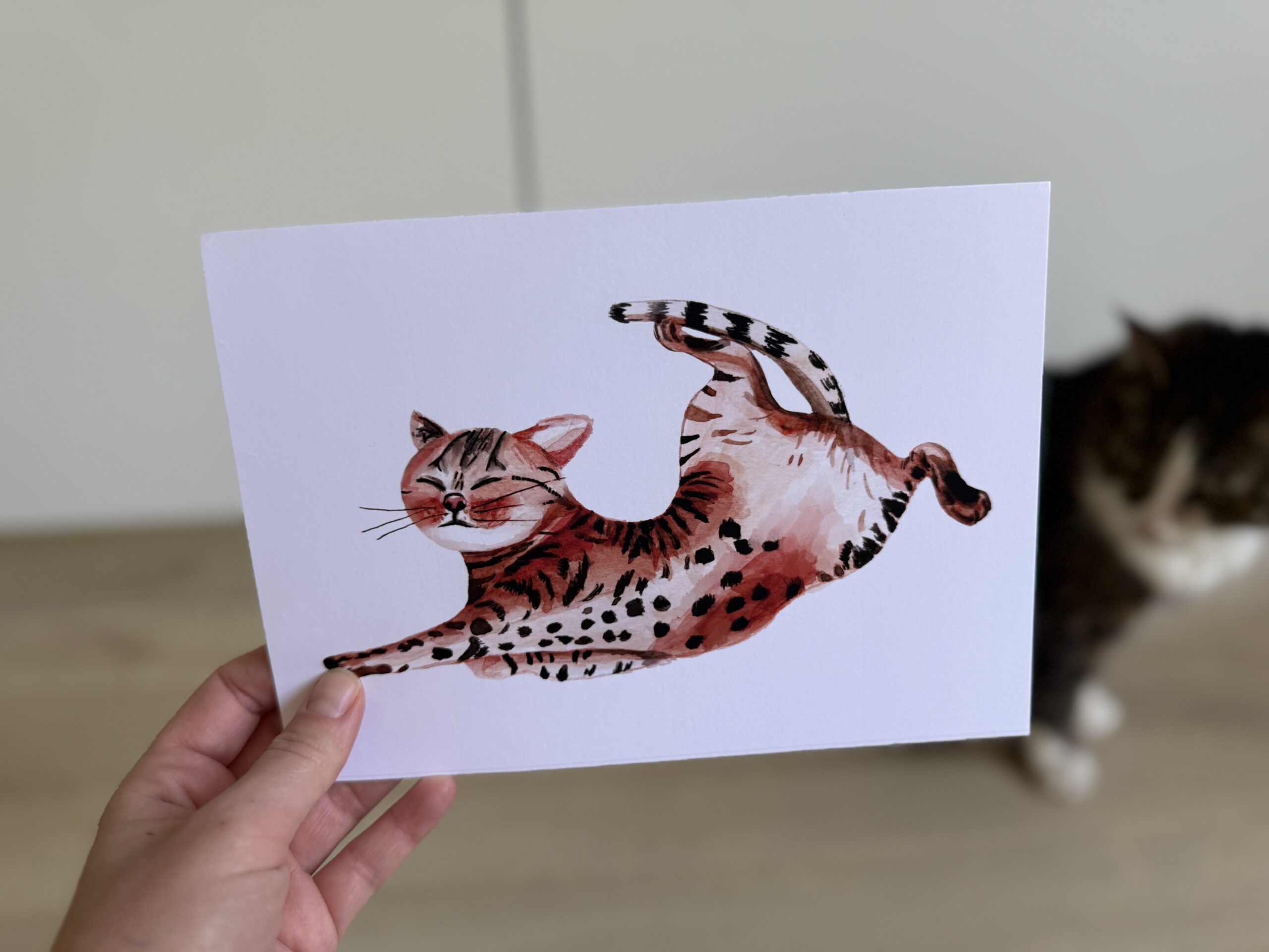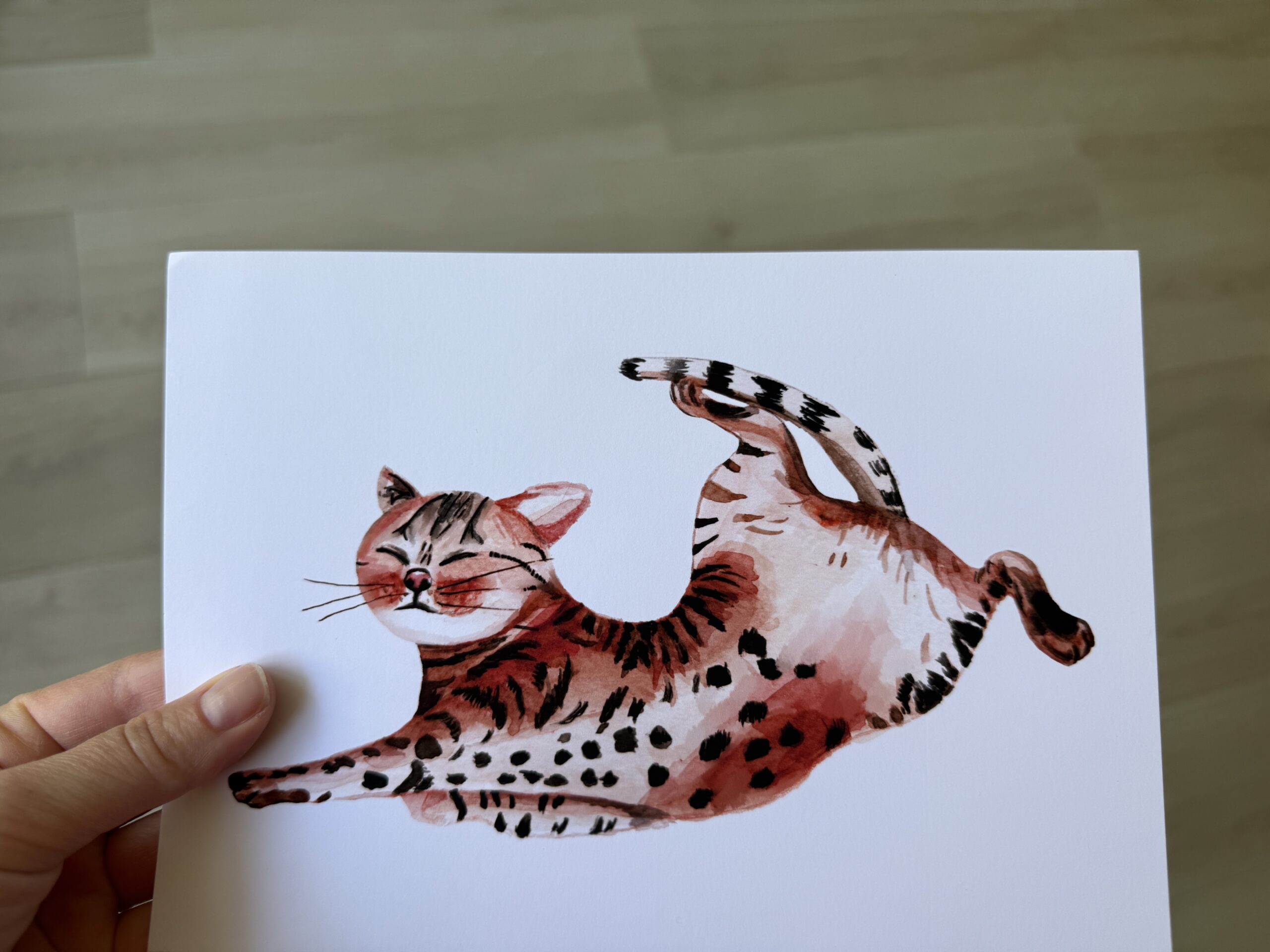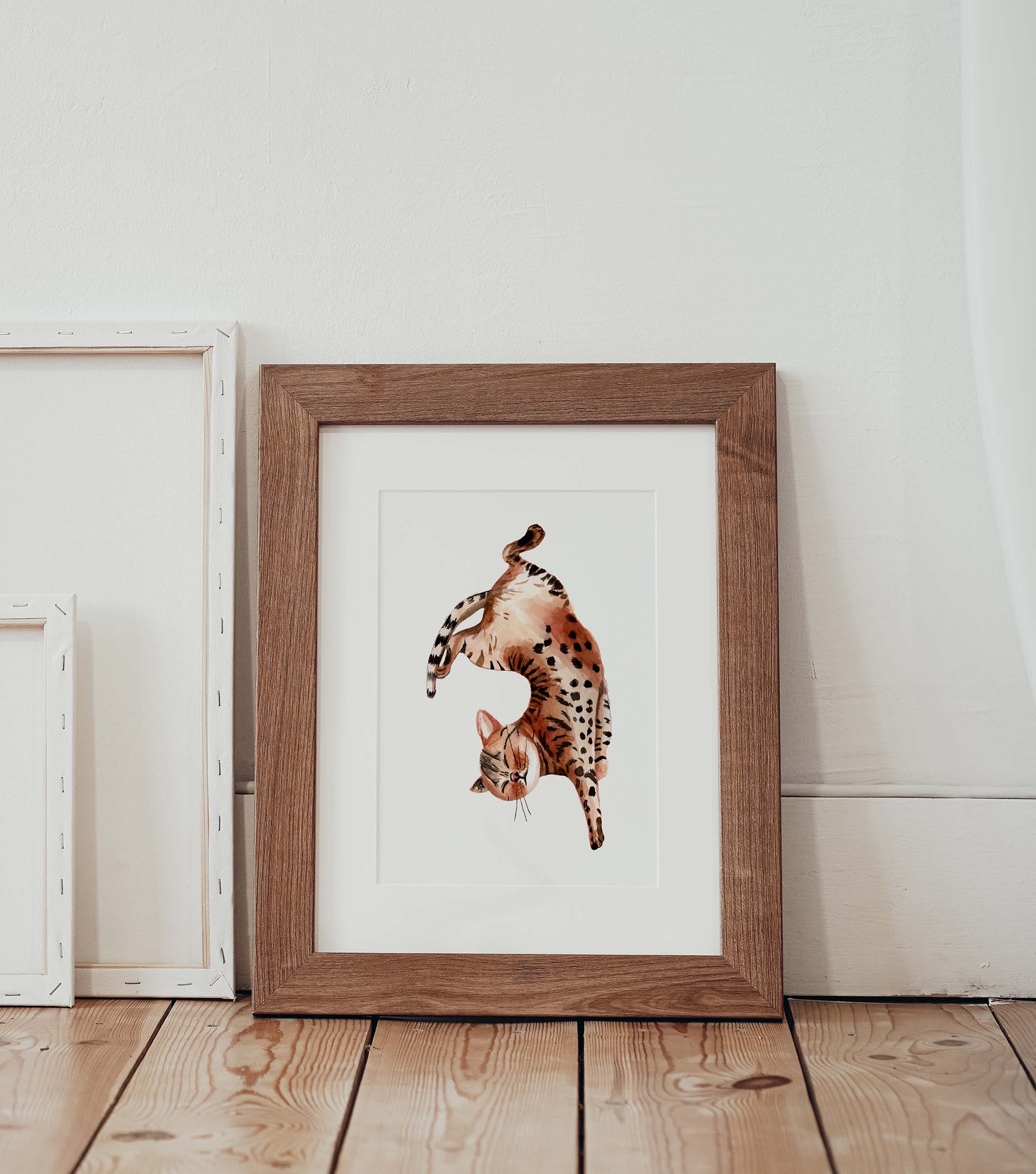 Celebrate carefree joy moments with Blissful Leap watercolor art print, featuring a playful Bengal cat captured mid-stretch, radiating pure happiness.