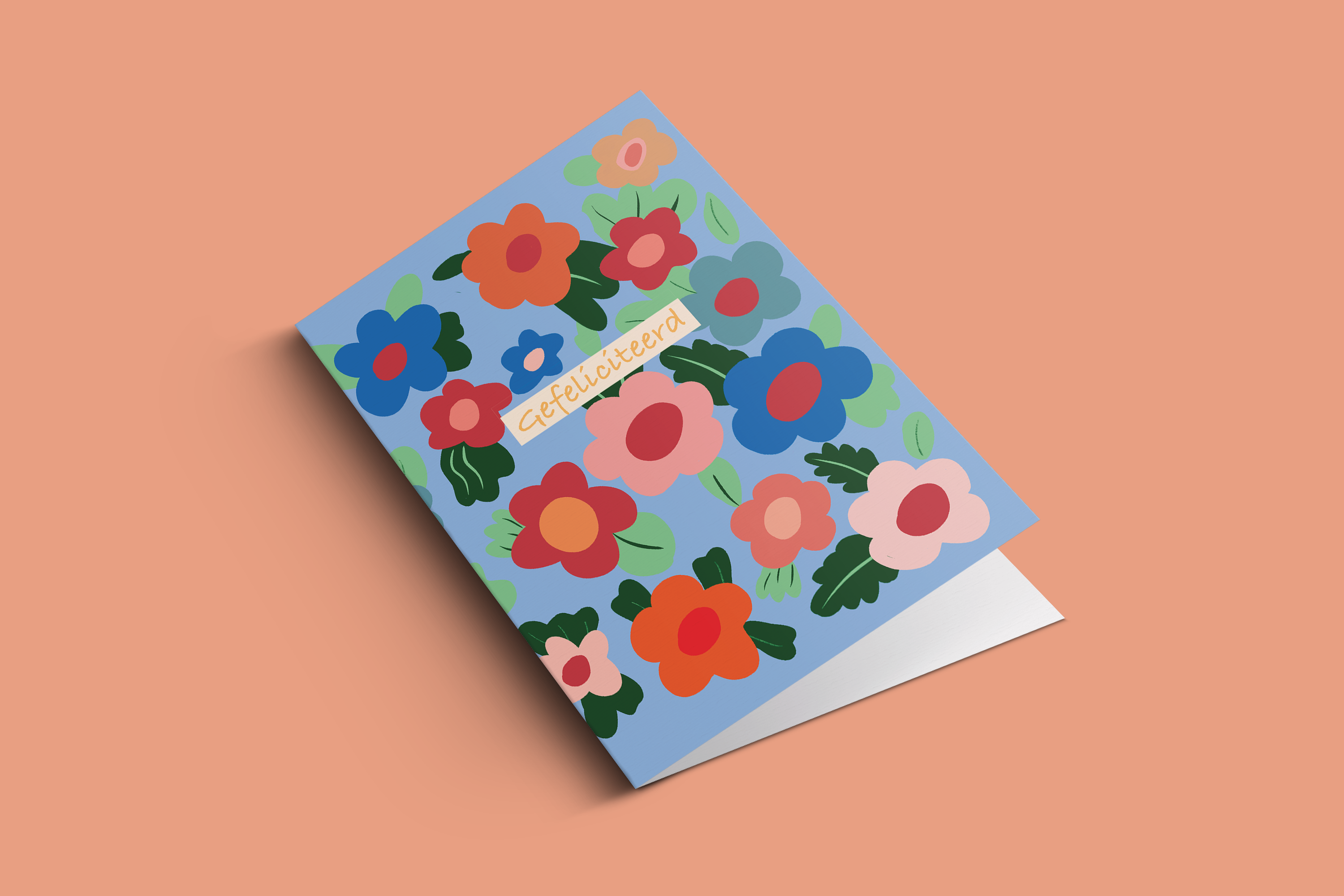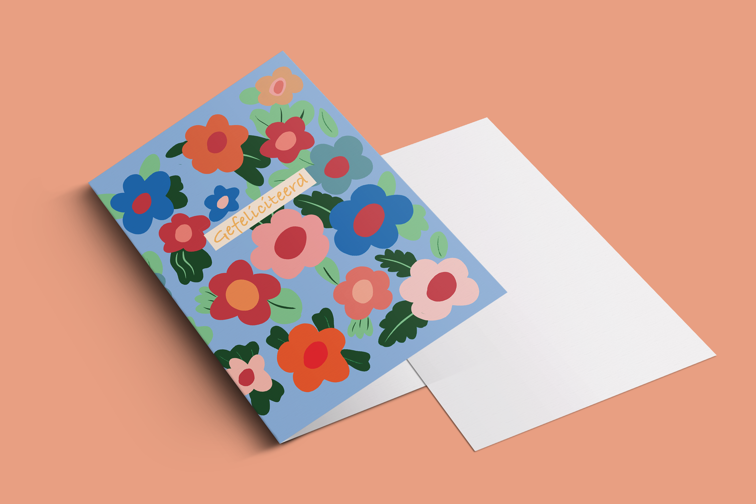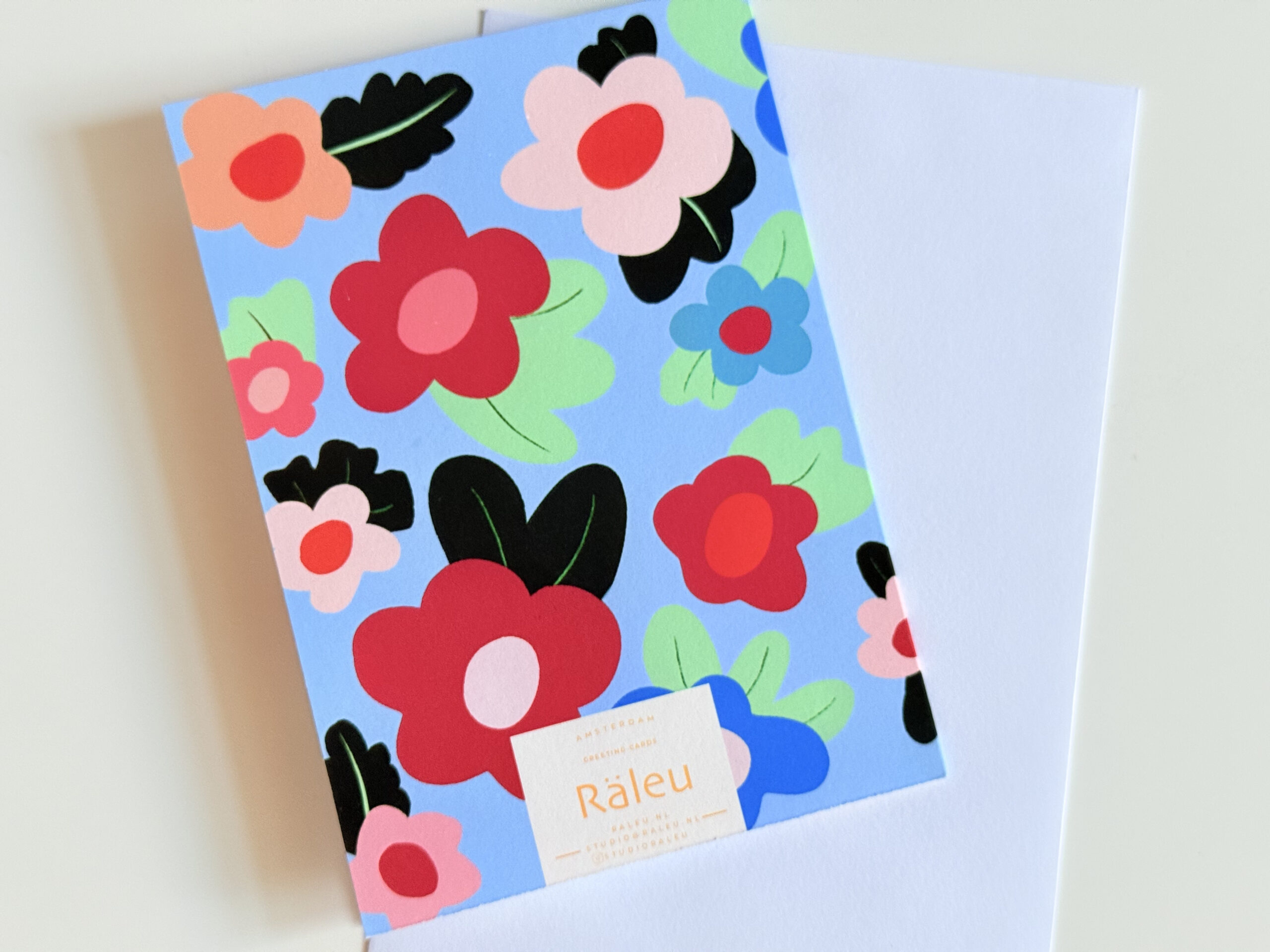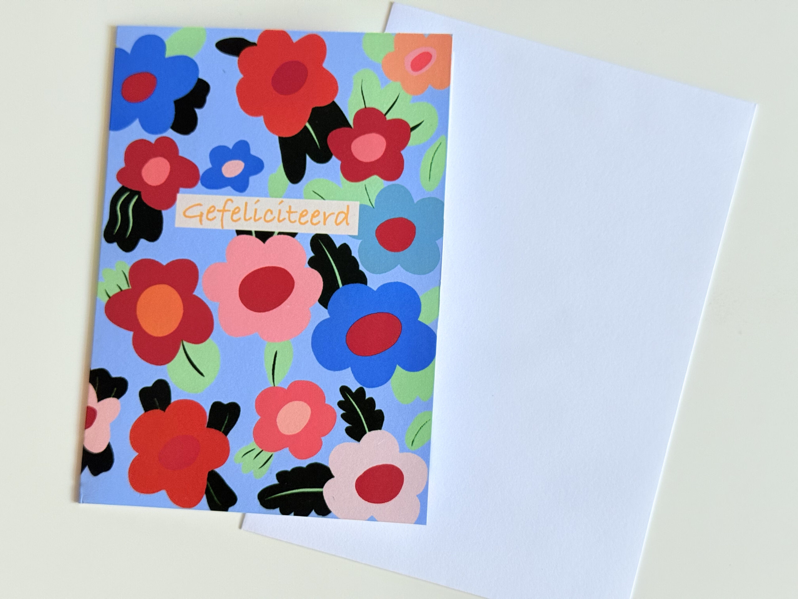 Greeting Card Raleu Flowers Gefeliciteerd Illustration on cover with white envelope.