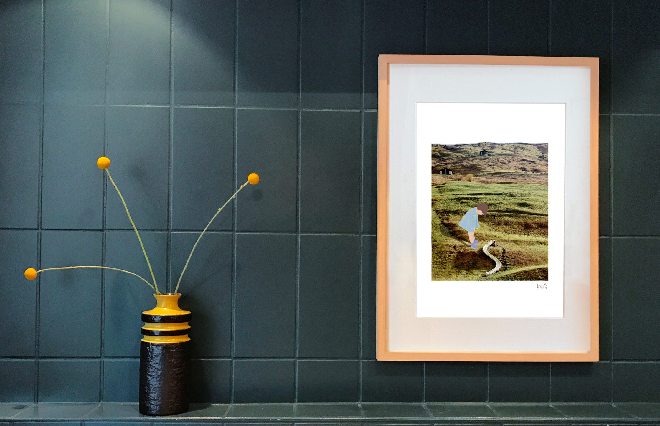 This art print, titled ‘Nature’s Play,’ in a rustic landscape of Swiss Alps- Vals. The collage-style composition combines photography and illustration, evoking a sense of wonder and the timeless bond between humans and nature.