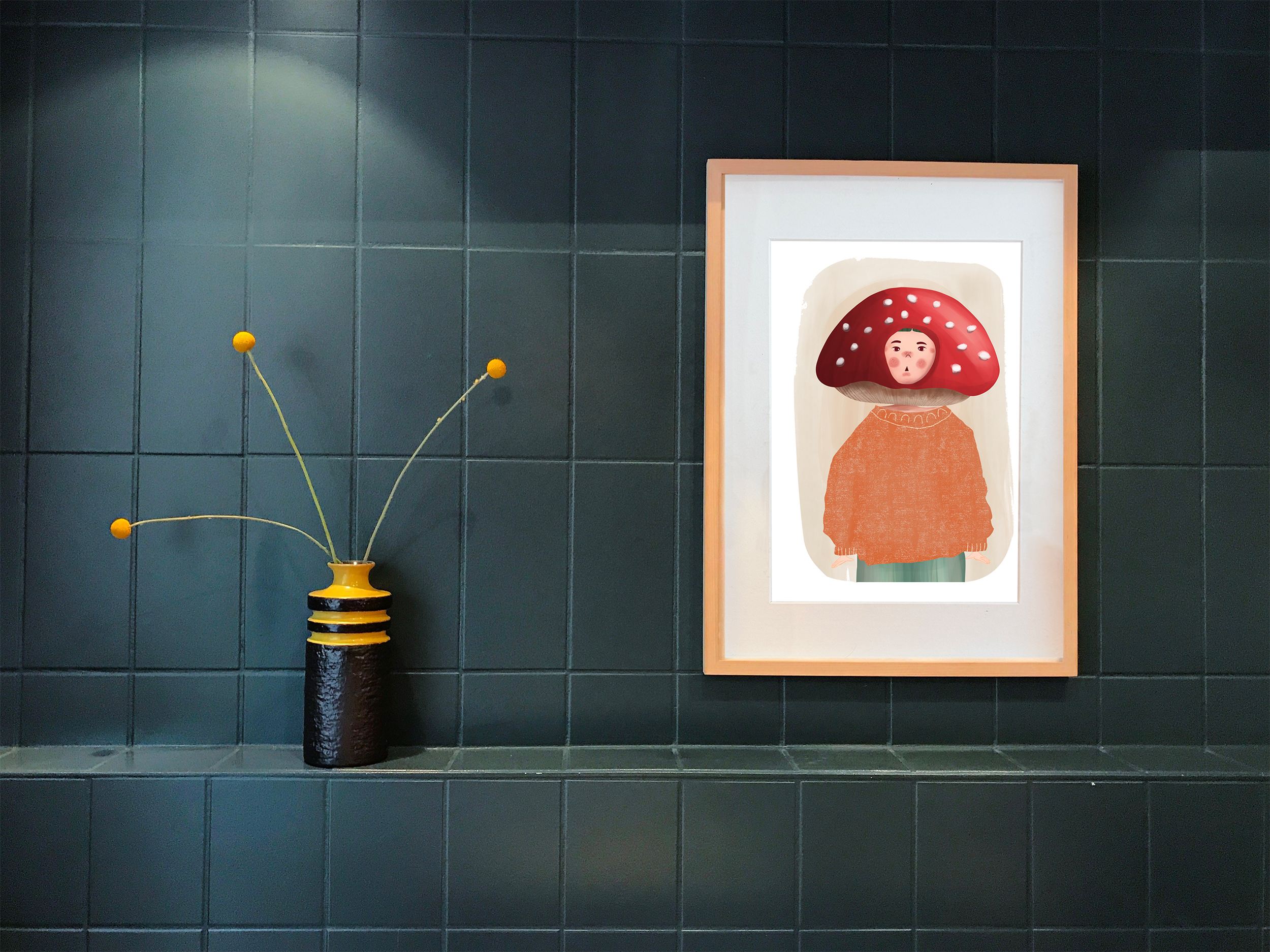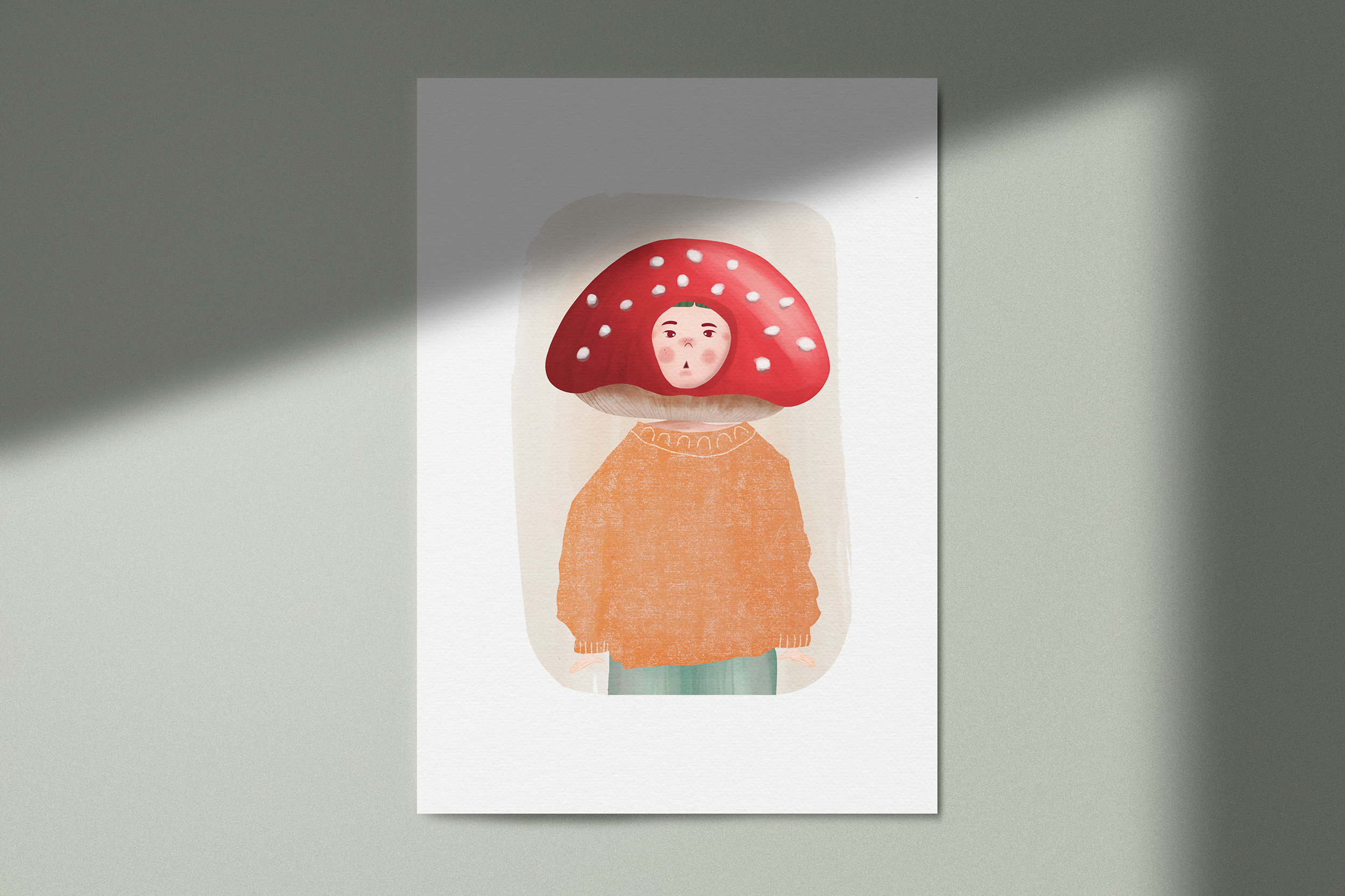 Continuing the story of the Pumpkin-Head Girl and Tangled Light Girl, this piece explores the magical weight and complexity of our inner worlds. The mushroom-headed girl symbolizes how rich, jungle like, and quietly powerful our thoughts can be.