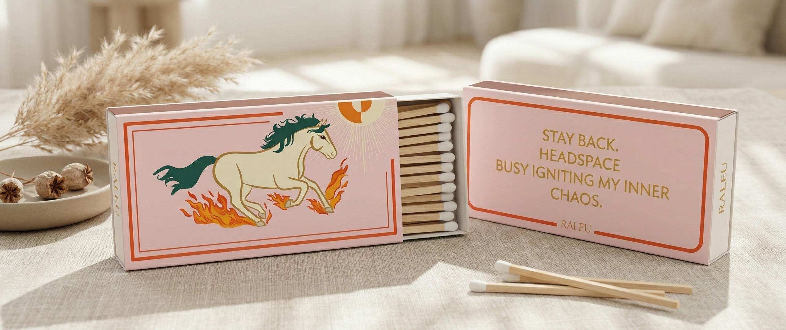 Soft aesthetic, fierce energy. Embrace the untamed spirit of the Year of the Horse with a matchbox that speaks your mind. Featuring a beautifully wild horse design on the front and a bold reminder to protect your peace on the back (“STAY BACK. HEADSPACE BUSY IGNITING MY INNER CHAOS.”).